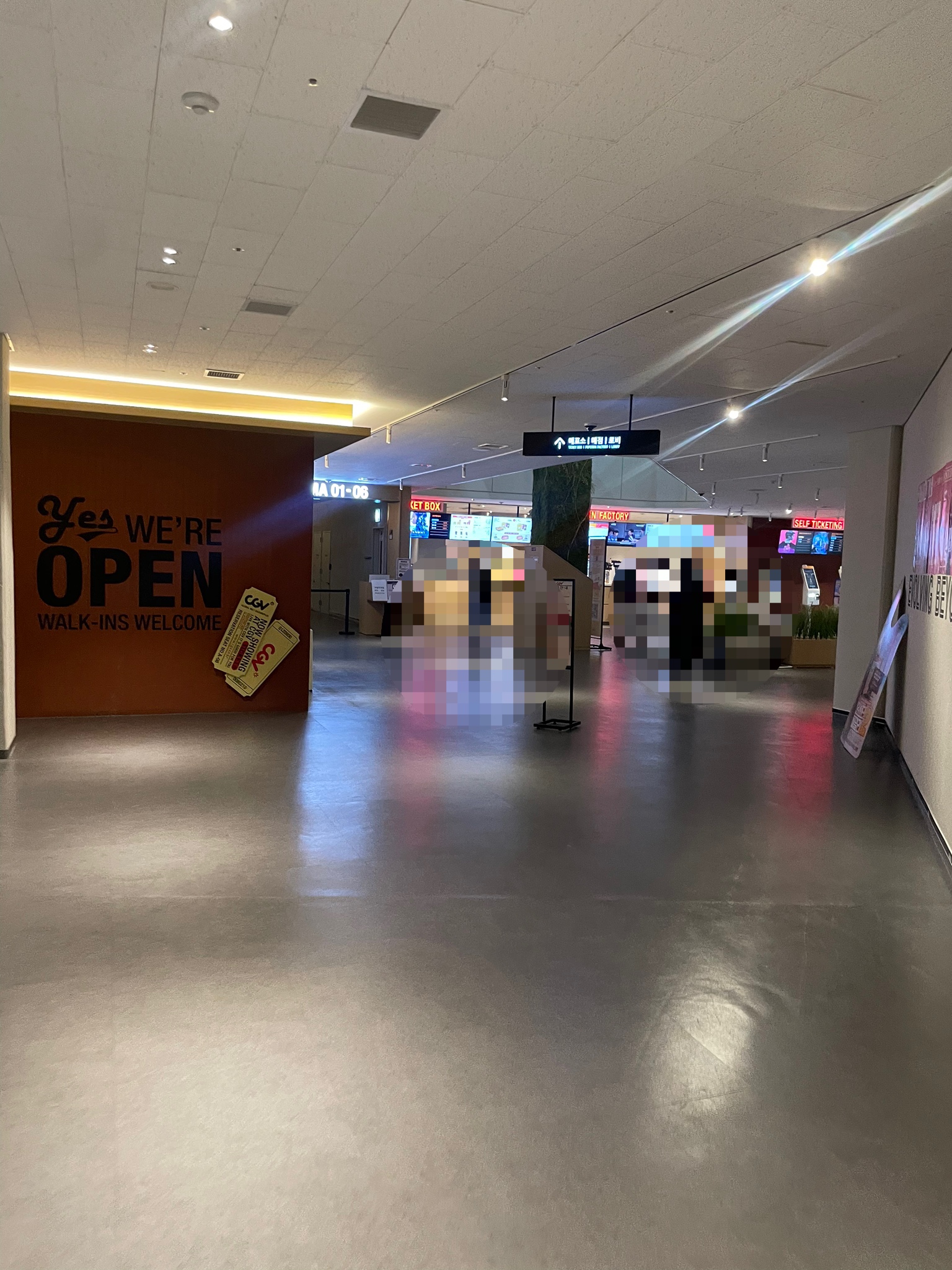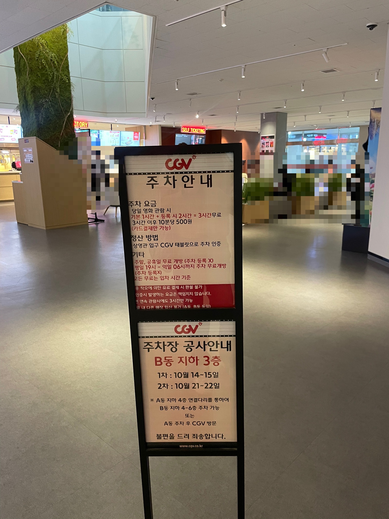 지하 3층 주차장은 공사 중이라고 해요. 저희는 여유롭게 지하 4층 주차장에 주차했어요. 주차요금은 무료! 주말과 공휴일에는 주차요금이 무료하고 합니다. 지하주차장에 cgv 가는 길 표시가 잘 되어 있어 어렵지 않게 잘 찾아갈 수 있었어요. CGV위치는 지하 2층에 있고, 지하주차장에서부터 연결된 에스컬레이터를 타고 올라가니 어렵지 않게 찾을 수 있었어요.